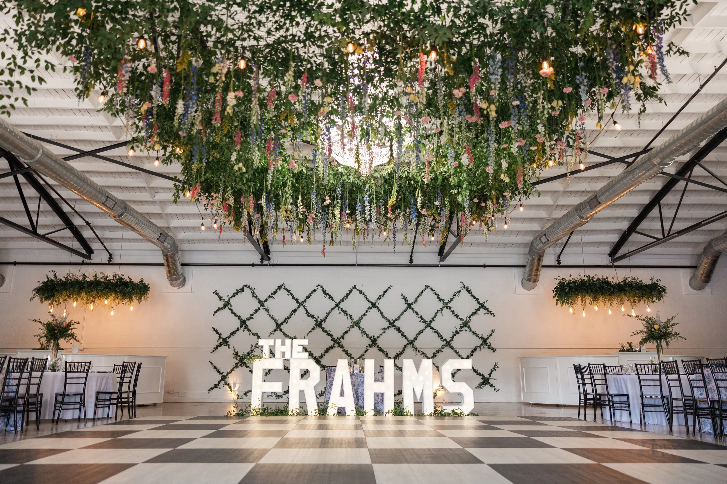 The design didn’t stop at table arrangements either. Florals were installed throughout the venue in a way that made the entire space feel cohesive and immersive. One of the most eye-catching elements was the floral installation over the dance floor—lush arrangements draped overhead, creating a canopy of color that completely transformed the space. As the evening went on, guests danced beneath it, surrounded by layers of texture and movement, which made for such a visually dynamic reception.